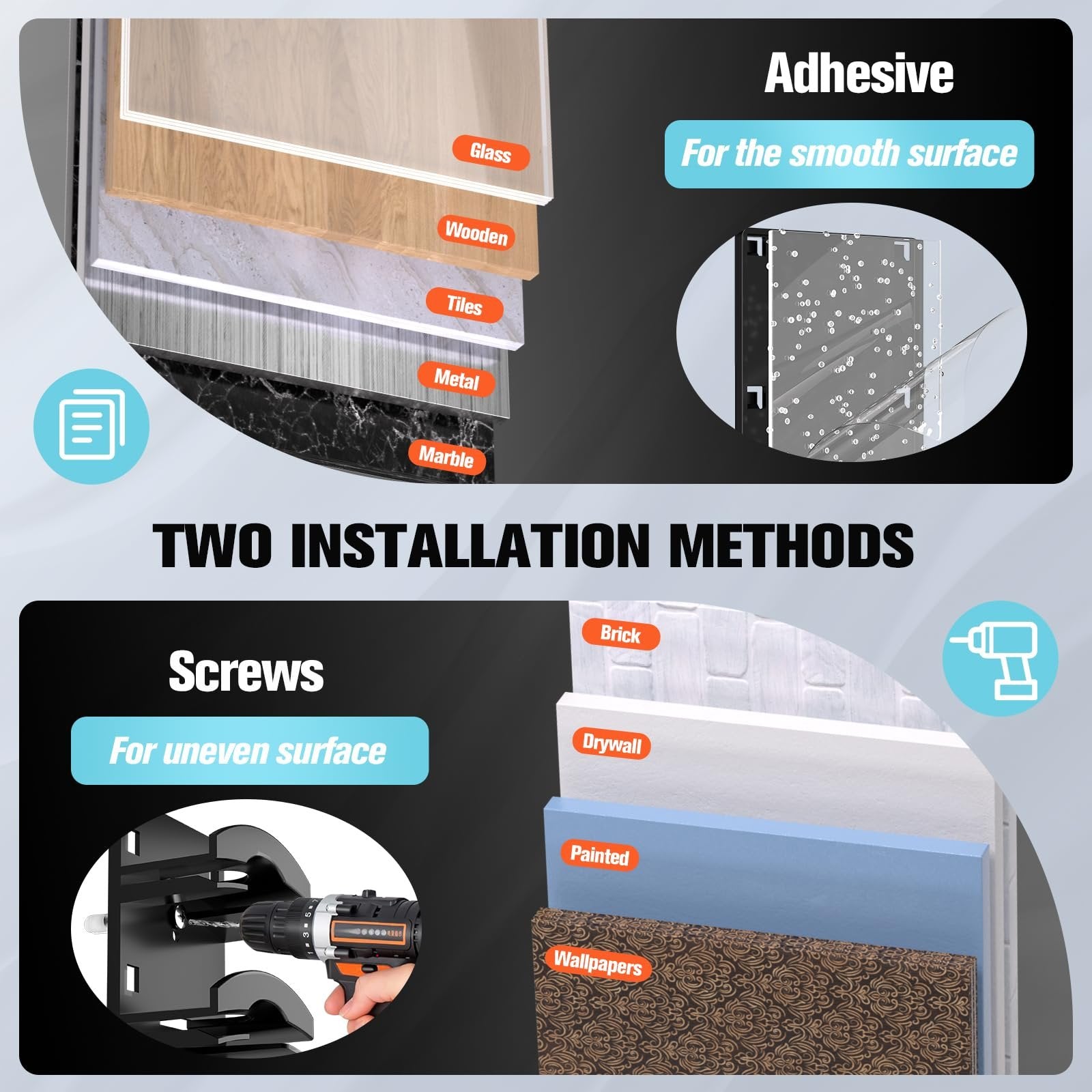 🛠️ Two Installation Methods: Stick it up with strong adhesive or use the screw mounts for rough surfaces. Just choose the right method and place once.
